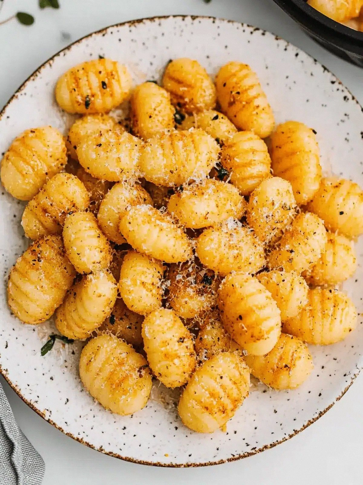 - Transfer the gnocchi to a serving platter and give it a final toss to distribute any remaining herbs or seasoning. The dish should look like a handful of golden, crispy balls that are begging to be devoured. The aroma should be warm and inviting, with hints of garlic and herbs. At this point, you can add a final sprinkle of grated Parmesan or a squeeze of lemon for an extra burst of flavor, but that’s optional.