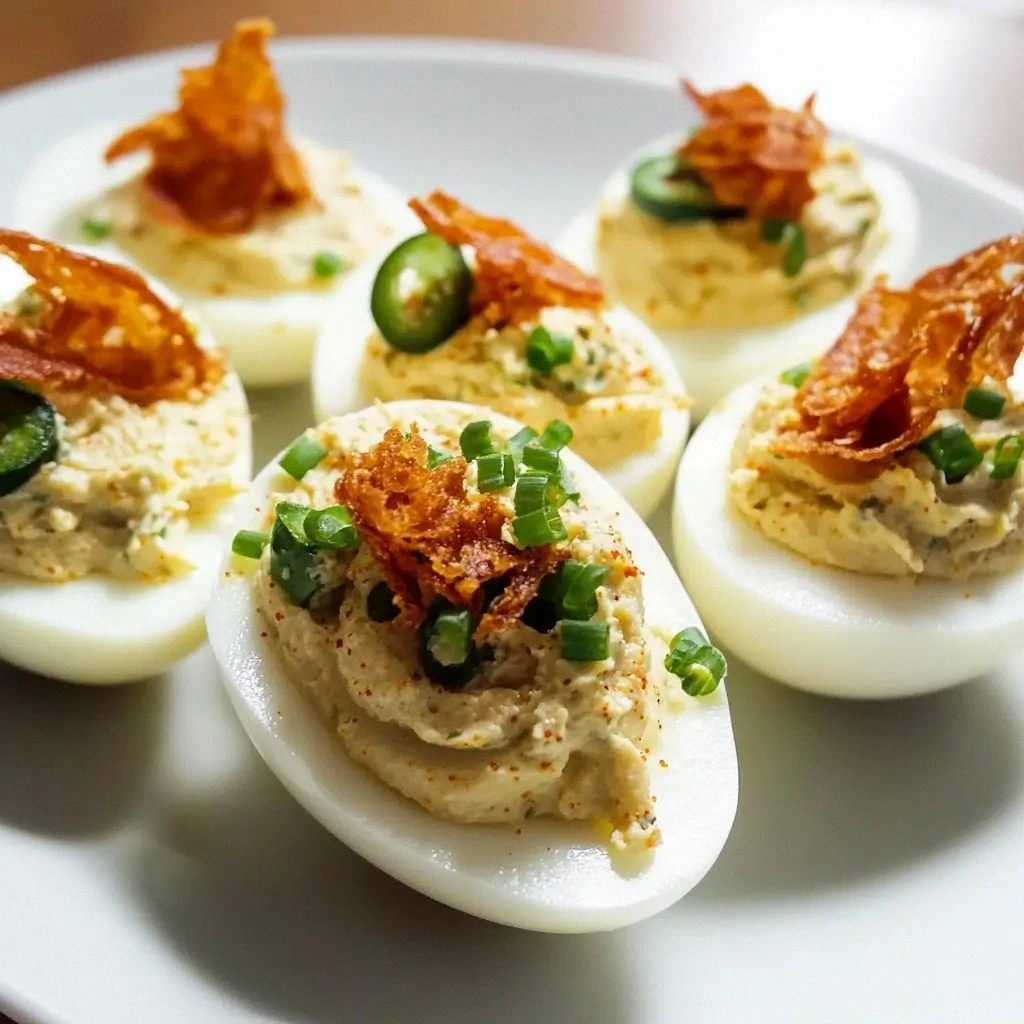 Arrange the deviled eggs on a platter with a splash of fresh salsa or a small bowl of lime wedges. The visual contrast of the bright green garnish against the golden yolk filling creates an Instagram‑ready presentation that will impress your guests.