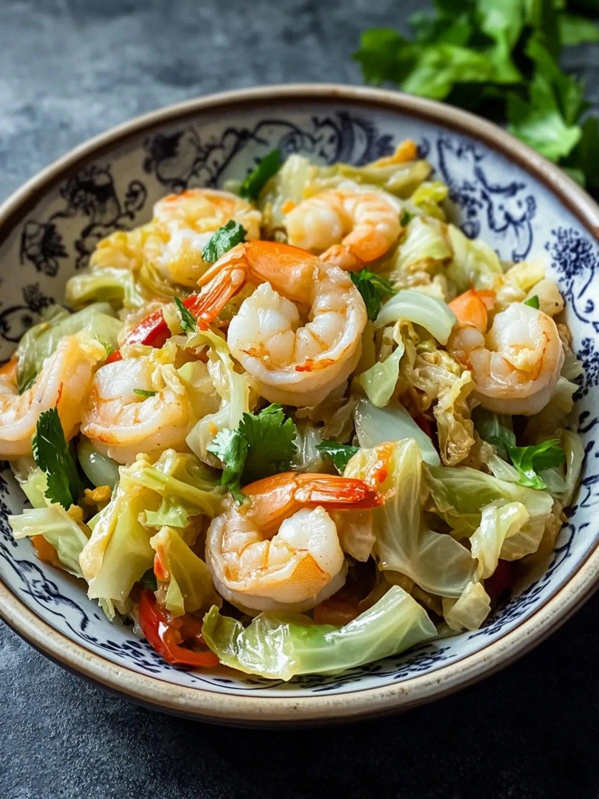 Incorporate sliced bell peppers and snow peas for a rainbow of colors and textures. Add a splash of rice vinegar at the end to brighten the flavors. The crisp vegetables complement the tender shrimp and cabbage, creating a multi‑layered crunch.